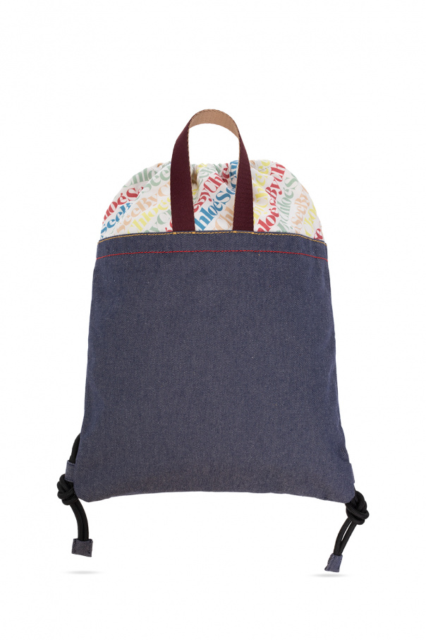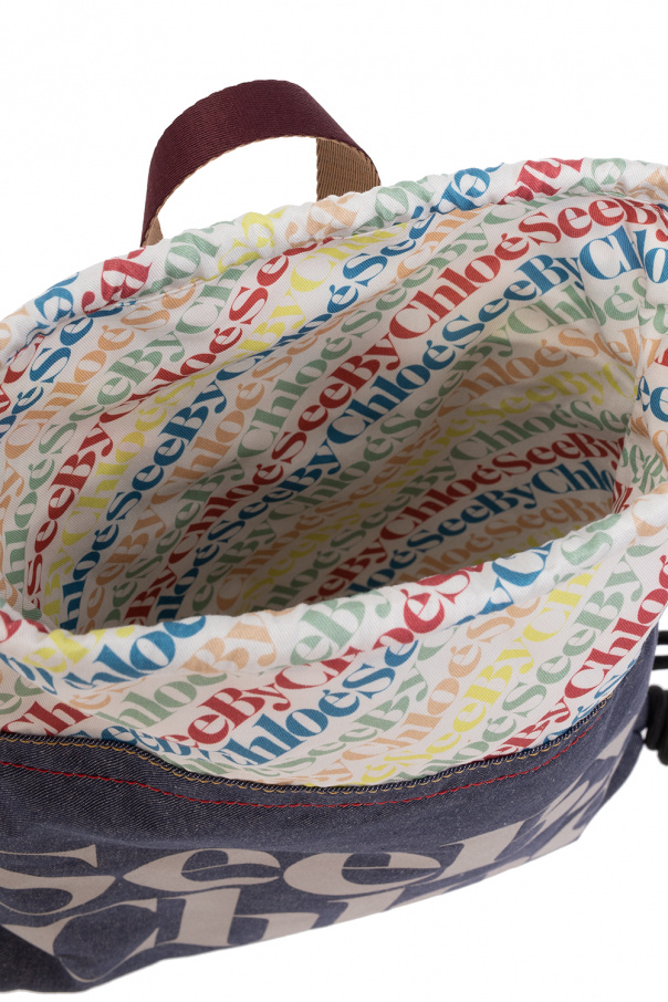 Navy and white ‘Gym’ backpack from See By Chloé. Fastened with drawstrings, this garment features a multicolored logo print, two half-round handles and one internal compartment.