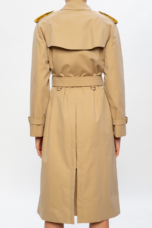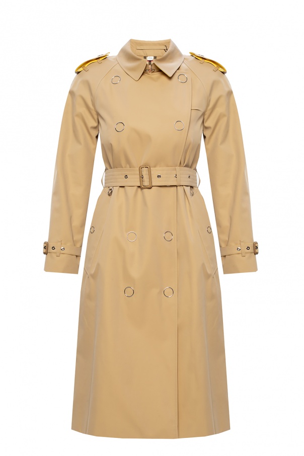 Beige trench coat from Burberry. Crafted from 100% cotton, this double-breasted design has snap fastening, standing collar which fastens via distinctive hook, two snap-fastened pockets, silver-tone metal hardware and included buckle belt to accentuate the waist. Furthermore, the lining is composed of yellow and beige patchworked pieces of fabrics in label's hallmark check pattern.
