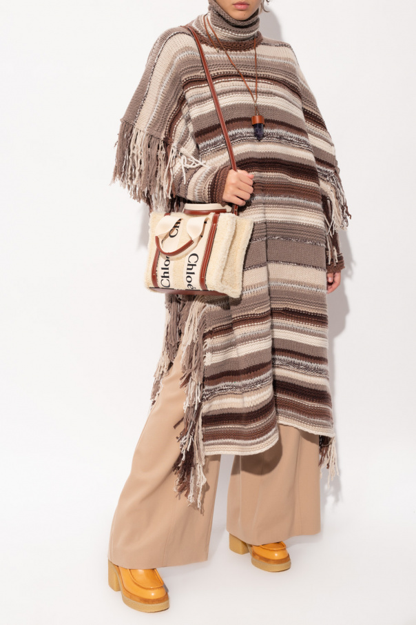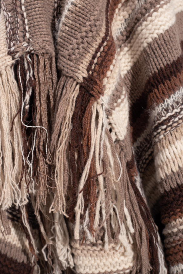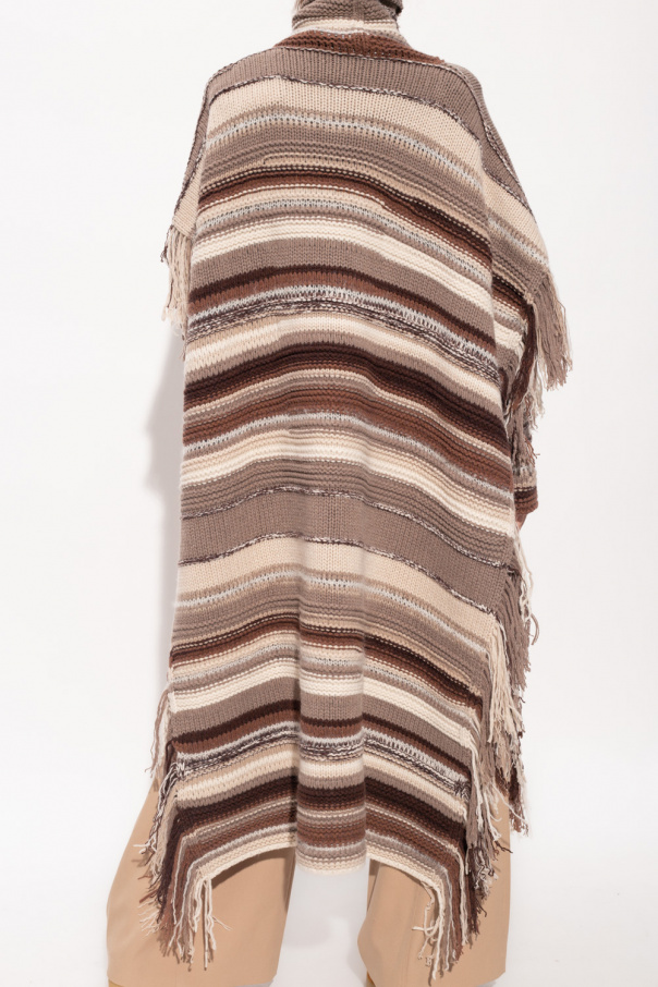Beige and brown striped turtleneck poncho with fringes from Chloé. Made of cashmere.