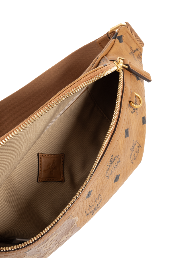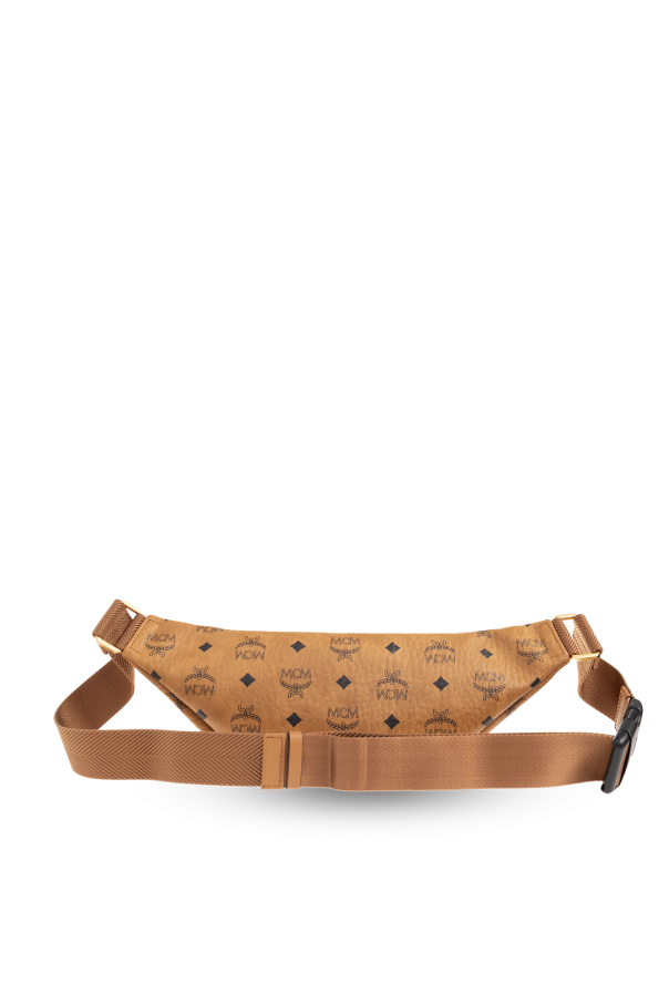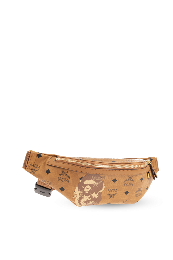 Brown ‘Fursten’ belt bag from MCM x BAPE. Crafted from coated canvas with a signature ‘Visetos’ monogram pattern in black, this design fastens via a two-way zip and showcases gold-tone graphic prints with a motif of a logo and dragon. It is complete with an adjustable buckle strap, gold-tone metal hardware as well as one internal compartment with a slip pocket. This model comes from a collection created in collaboration with A BATHING APE®, celebrating the Chinese New Year – the year of the dragon.
