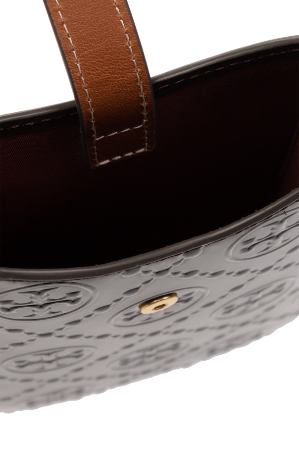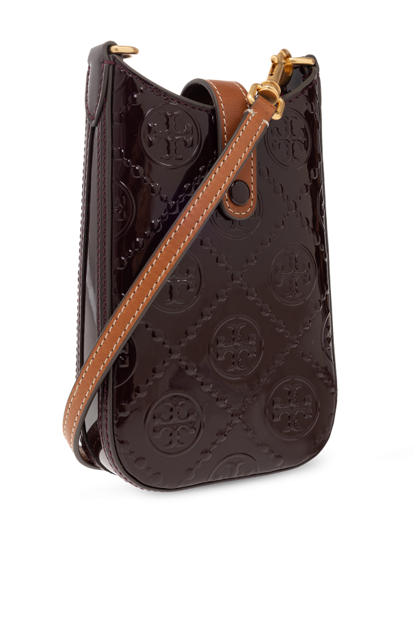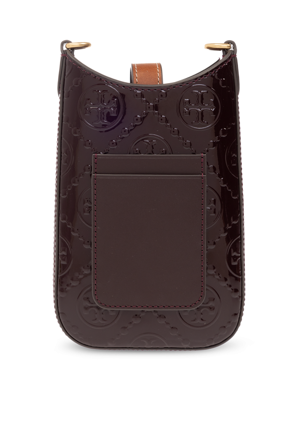 Maroon ‘T Monogram’ phone case from Tory Burch. Crafted from cow leather, this item features a snap closure, embossed logo, detachable shoulder strap, two card slots at the back, one internal compartment and gold-tone metal hardware.