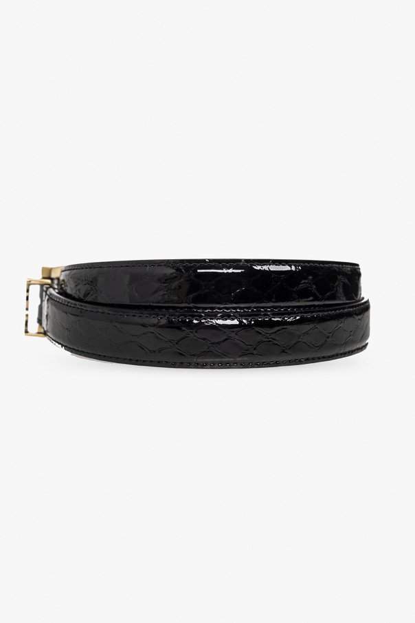 Black belt from Saint Laurent. Crafted from calf leather with a python skin effect, this item features a logo application and an antiqued gold-tone brass buckle.