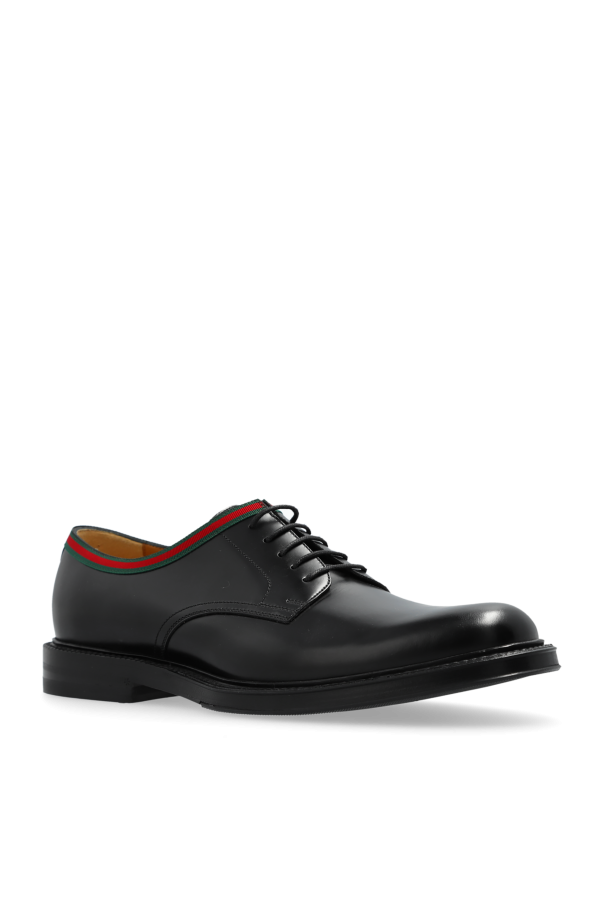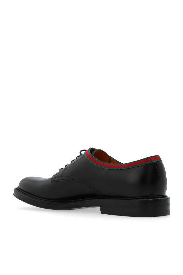 Black lace-up shoes from Gucci. Made of smooth leather. Embellished with green-red-green grosgrain 'Web' trim. They rest on black and beige sole made of leather and rubber.
