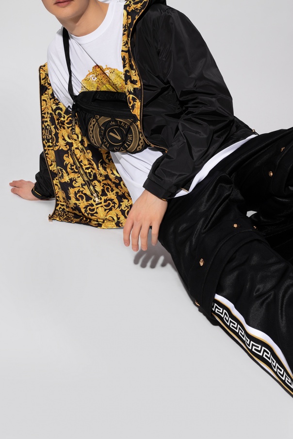 Black belt bag from Versace Jeans Couture. Fastened with a zip and drawstrings, this design features a gold-tone logo print, back zip pocket, logo-embroidered half-round handle, adjustable belt and one internal compartment with one slip pocket.