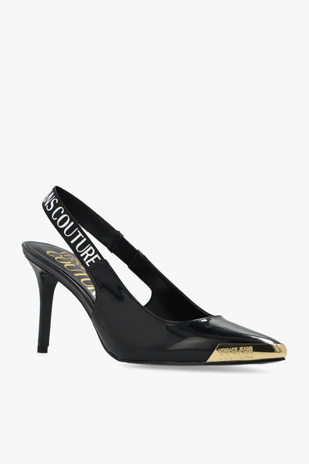 Black and white pumps from Versace Jeans Couture. Made of faux leather, this pair features an elastic strap with a logo and black rubber sole.