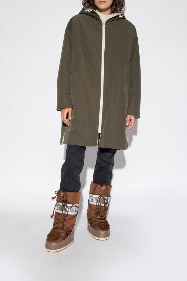 Brown ‘Icon Nylon’ snow boots from Moon Boot. This pair features double tie fastenings, logo print, silver-tone metal hardware and rubber sole in cream and black. Inspired by the peculiar shape and technology of the astronauts’ boots, the iconic style was designed in 1969 after the first Moon landing.