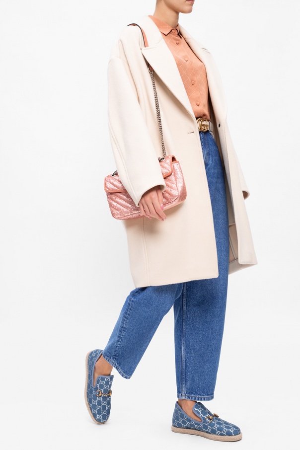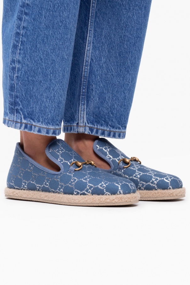 Blue loafers from Gucci. Resting on a beige rubber sole, this design features a logo pattern inlaid with a silver-tone lurex thread, the iconic horsebit in antiqued gold-tone, merino wool lining and a beige rubber sole.