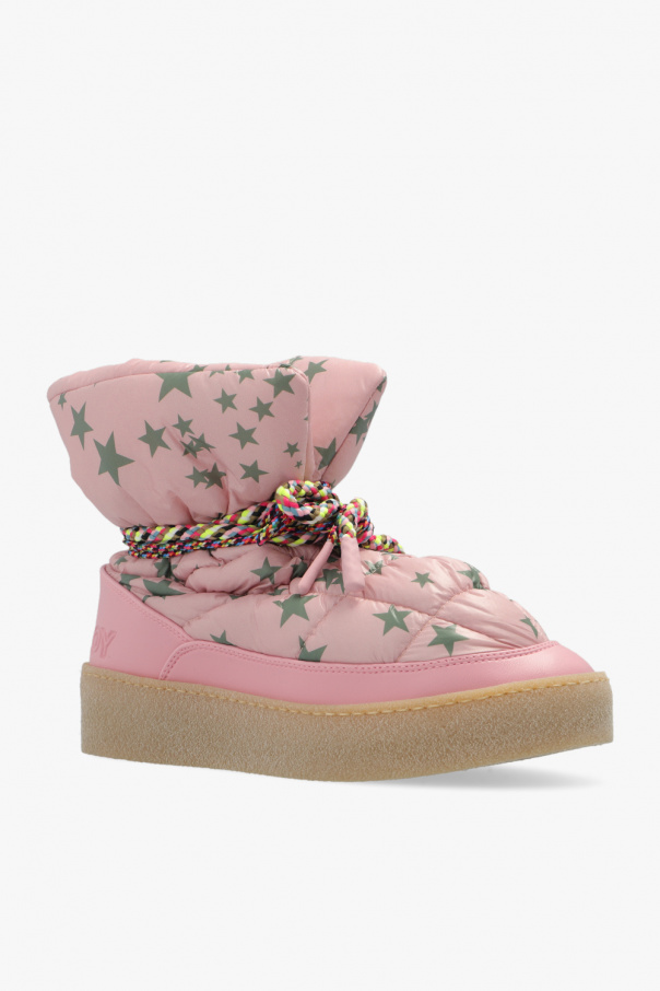 Pink snow boots from Khrisjoy. Embellished with a dark green motif of stars, this lace-up model sits on a brown rubber sole and features an embossed logo at the back.