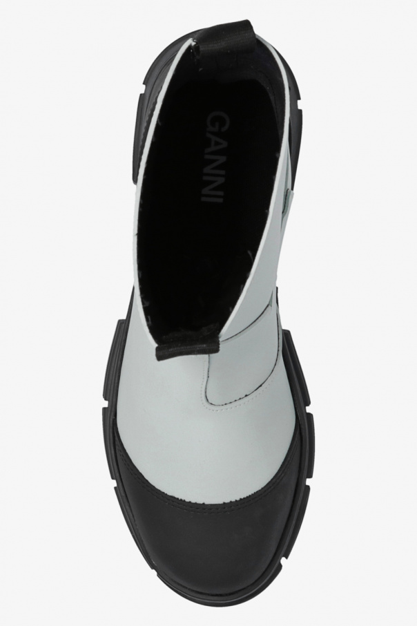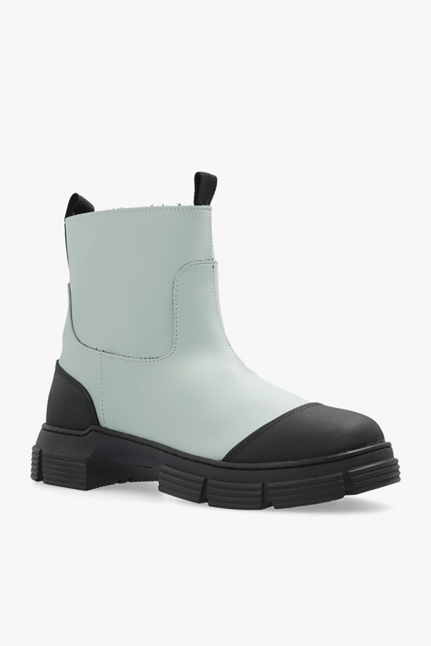Short, blue rain boots from Ganni. Resting on a black rubber sole, this pair features decorative stitching and grosgrain strap with a logo.