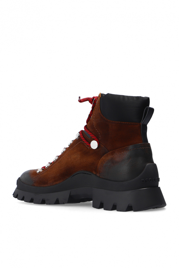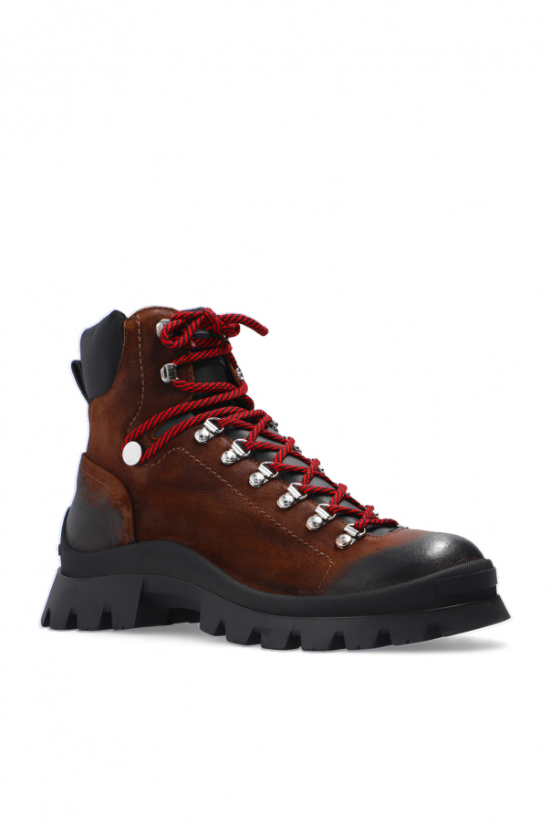 Brown and black boots from Dsquared2. Made of leather, this lace-up design features a raised rubber logo appliqué at the back, black rubber sole and silver-tone metal hardware.