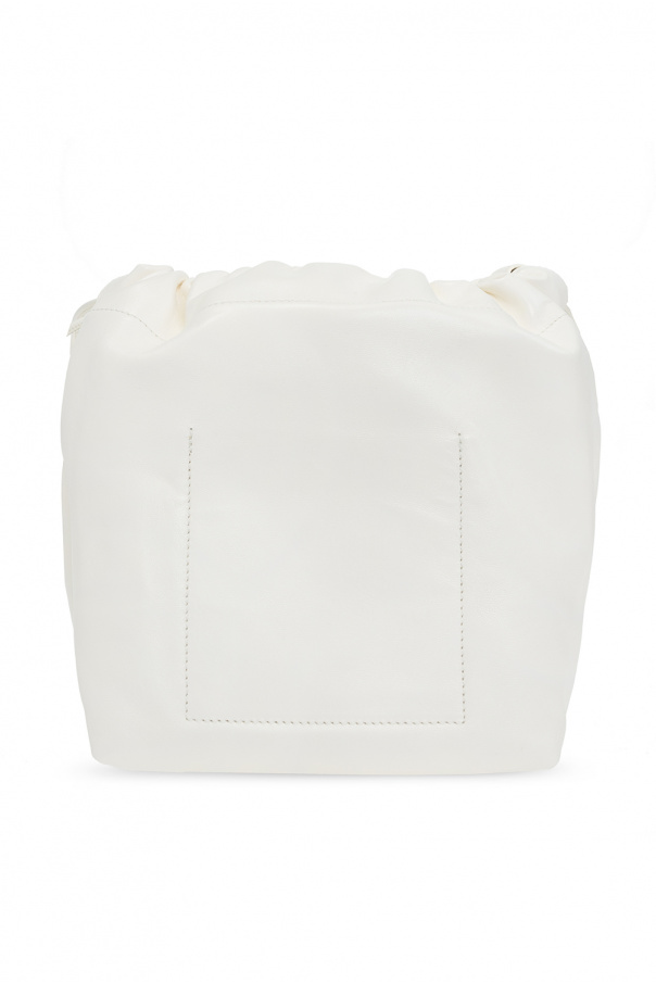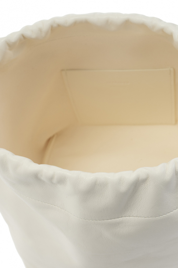 White ‘Drawstring Small’ shoulder bag from Jil Sander. Crafted from calf leather and lamb leather, this design cinches closed with two drawstrings and features two shoulder straps, an embossed logo on the front and one internal compartment with a card slot.