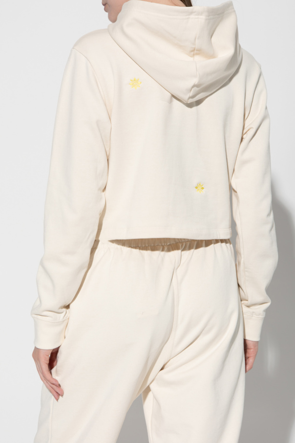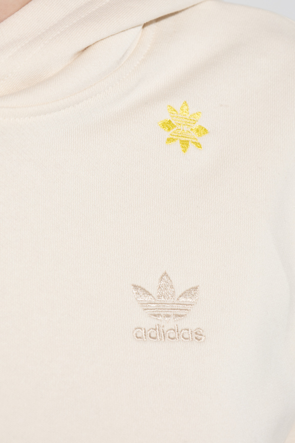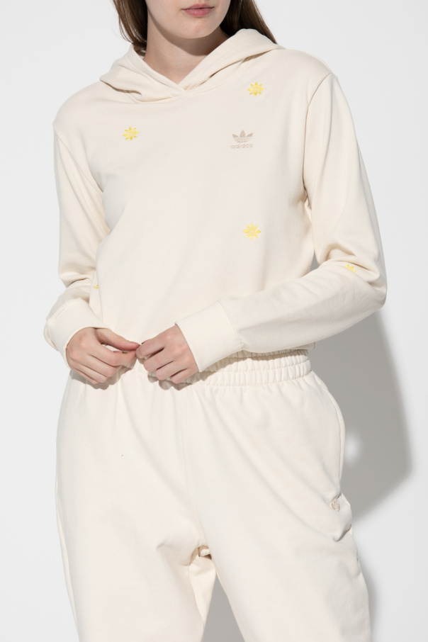 Cream hoodie from ADIDAS Originals, the ‘End Plastic Waste’ collection. Made of cotton, this garment features a drawstring hood, embroidered pattern in yellow, logo detail and long sleeves with ribbed cuffs.