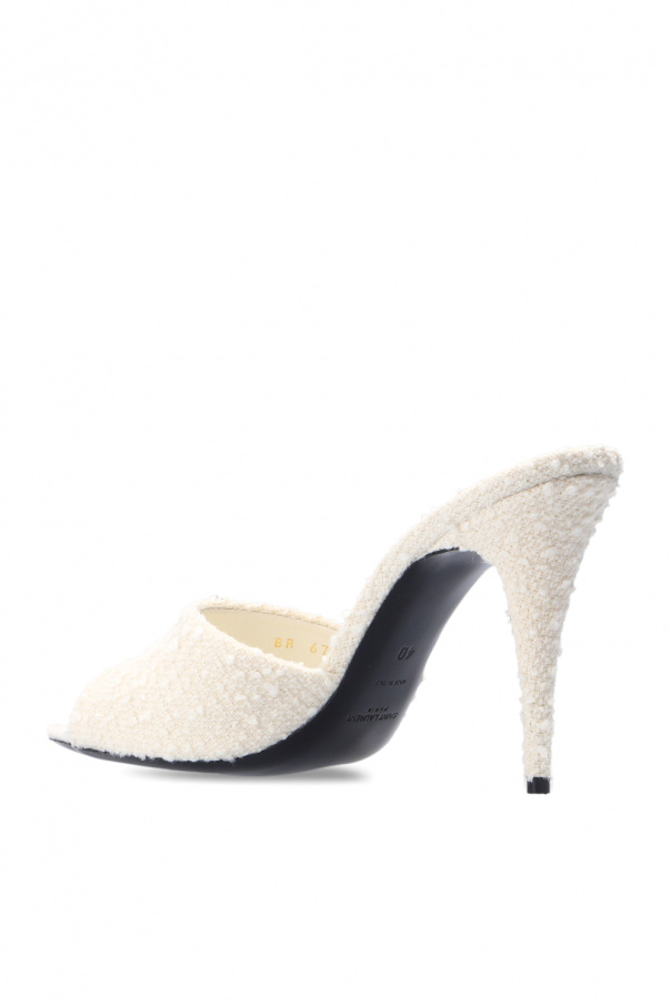 Cream ‘LA 16’ mules from Saint Laurent. Crafted from leather covered with terrycloth, this model sits on a black leather sole.