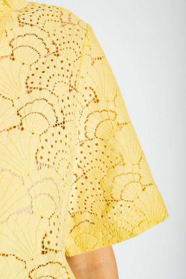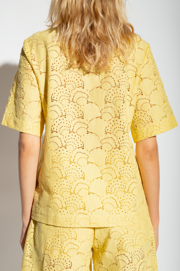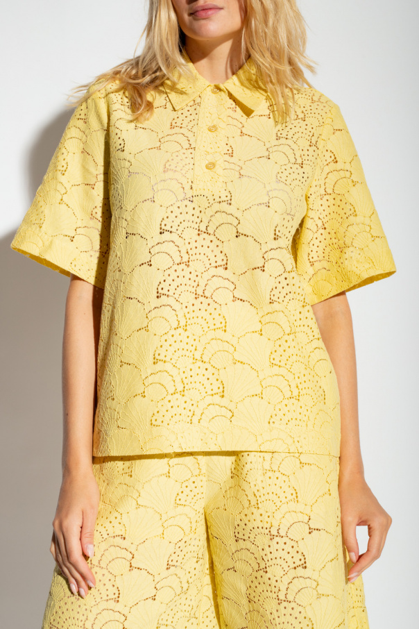 Yellow ‘Karen’ lace polo shirt from Samsoe Samsoe. Crafted from an organic cotton blend, this loose-fitting design features button fastenings, openwork pattern with a shell motif and short sleeves.
