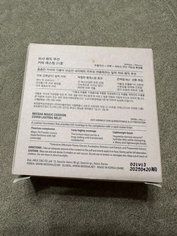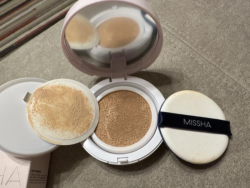 Кушон корейской косметики Missha, безупречный цвет, долговременное покрытие, легкая отделка, spf 50 уход, против морщин и защита от ультрафиолета. Купила в Америке по интернету, использовала раз, неподходил тон- слишком светлый для моей кожи.