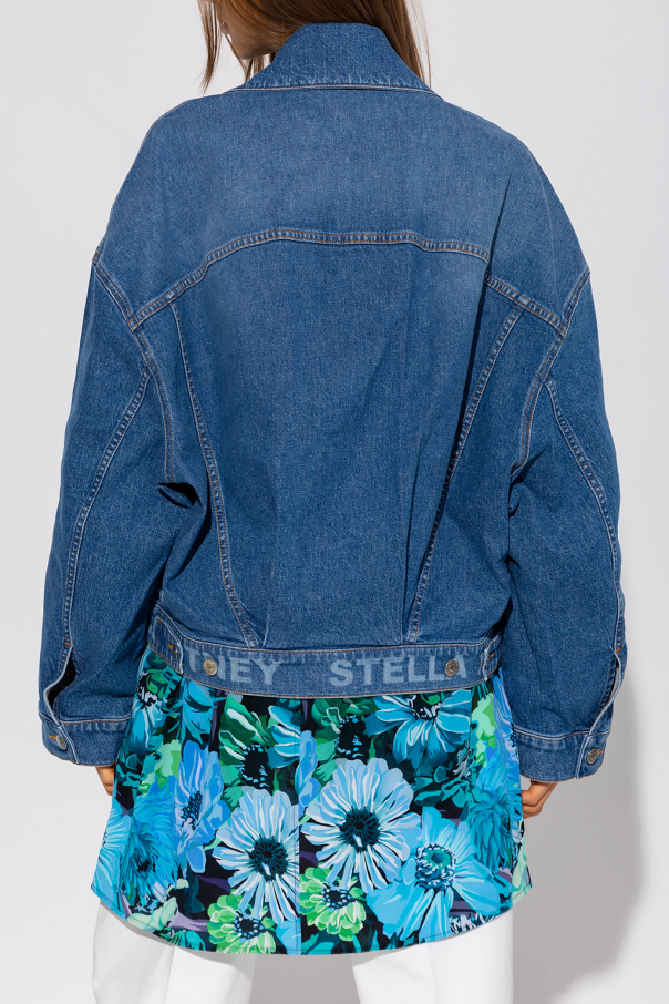 Blue jacket from Stella McCartney. Crafted from cotton, this garment features button fastenings, light blue logo pattern, two slip pockets, two buttoned flap pockets and long sleeves with banded cuffs.