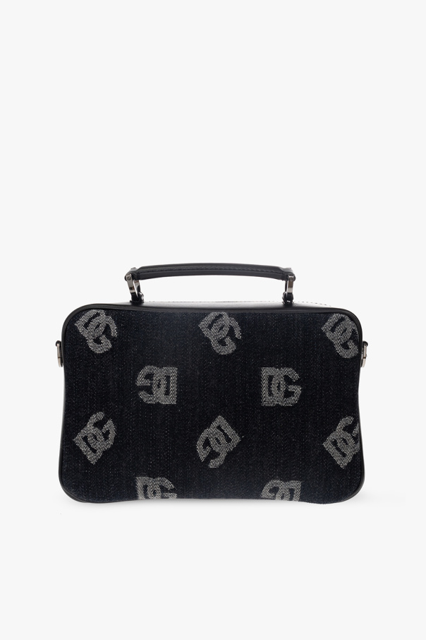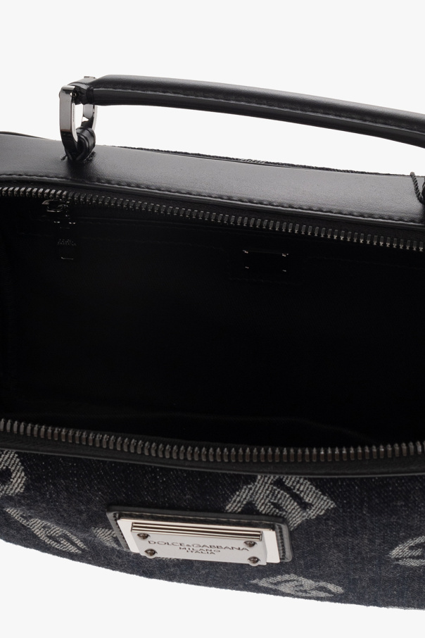 Navy blue and black shoulder bag from Dolce & Gabbana. Rendered in denim and trimmed with calf leather, this design fastens with a zipper and showcases a jacquard monogram pattern. It is complete with a logo-engraved plaque in silver-tone, a top handle, a detachable and adjustable shoulder strap, silver-tone metal elements and one internal compartment with one slip pocket and one zip pocket.