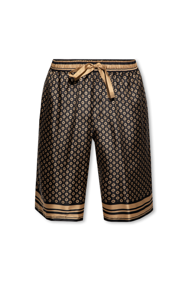 Black and beige shorts from Dolce & Gabbana. Made of silk. Fastened with drawstrings, this pair features a monogram, two front pockets, one buttoned back pocket and slits on the sides.