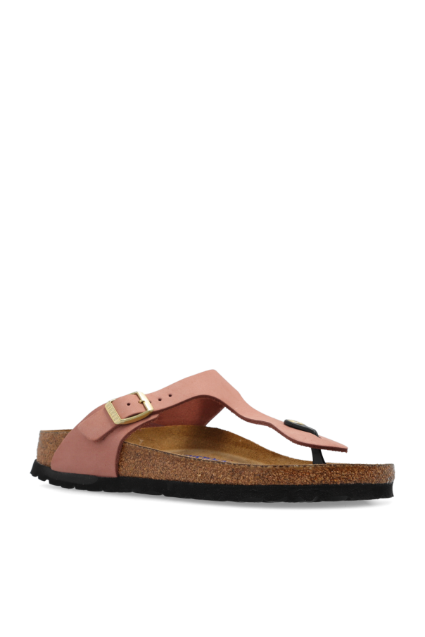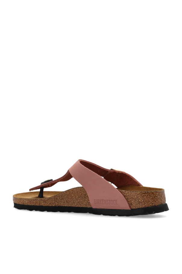 Dark pink 'Gizeh BS' slides from Birkenstock. Sitting on a natural cork sole with a black EVA foam trim, this model features an anatomically shaped cork-latex footbed and an adjustable buckle strap. Narrow width.
