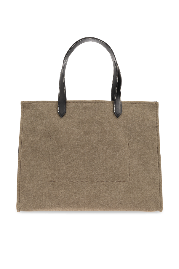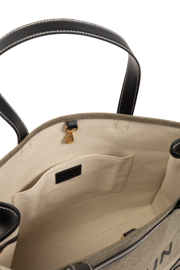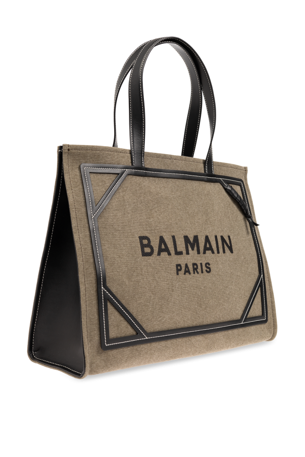 Green and black ‘B-Army 42’ bag from Balmain. Made of cotton canvas and trimmed with black calf leather, this design secures with a lobster clasp and showcases an embroidered back logo and a woven detail on the front. It is complete with a detachable and adjustable shoulder strap, contrasting white stitching, two half-round handles, gold-tone metal hardware and one internal compartment with one slip pocket and a removable pouch with a snap closure.