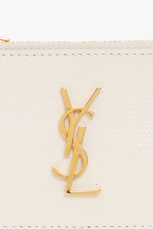 Cream card case from Saint Laurent. Crafted from patent calf leather with a crocodile skin effect, this design features logo hardware on the front, one zip pocket and five card slots at the back.