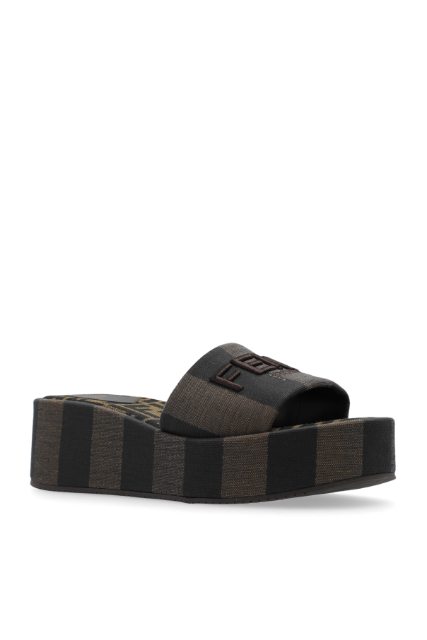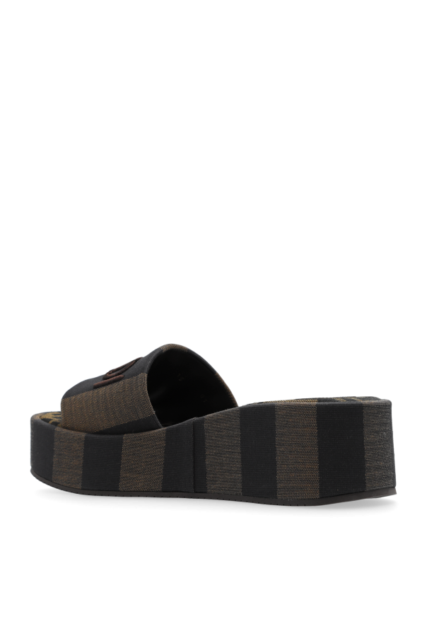 Introducing the ‘Sunshine’ Platform Slides from the exclusive collection by Fendi, a testament to luxurious design and sophisticated style. These slides feature a high, flat platform, offering an elegant boost to your stature while ensuring utmost comfort. The wide strap, crafted with precision from premium materials, boasts a distinctive pattern interwoven with the iconic Fendi logo, manifesting an aura of exclusivity. The harmonious design extends to the platform itself, adorned with a pattern that mirrors the strap, presenting a cohesive and stylish look. This pattern—a chic blend of dark and lighter stripes, accented with the designer’s logo—lends the slides a recognizable flair. Furthermore, the interior sole is embellished with the brand’s logo, a hallmark of luxury that underscores the exclusivity of these slides. Rendered in a dominant palette of black, enhanced with brown and beige elements, the ‘Sunshine’ slides exude sophistication. Crafted with a keen eye for detail, these slides promise high quality, a staple expectation for products from renowned designers like Fendi. Why Purchase This Product? Experience an unparalleled blend of comfort and height with the high, flat platform design. Embrace luxury with the signature Fendi pattern and logo, meticulously incorporated throughout the slides. Enjoy the exclusivity of a sophisticated palette and design, tailored for those who appreciate the finer things. Assured high-quality craftsmanship and materials, synonymous with the Fendi brand.