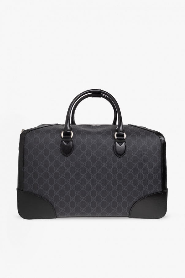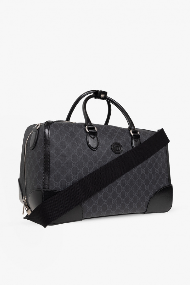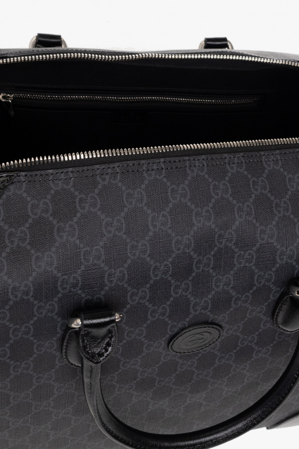 Black and grey from Gucci. Made of the brand’s signature GG Supreme canvas with leather trims, this model fastens with a two-way zip and is decorated with a patch embossed with the Interlocking G logo. It is complete with two half-round handles with a snap fastening, silver-tone metal hardware and one internal compartment with one slip pocket and one zip pocket.