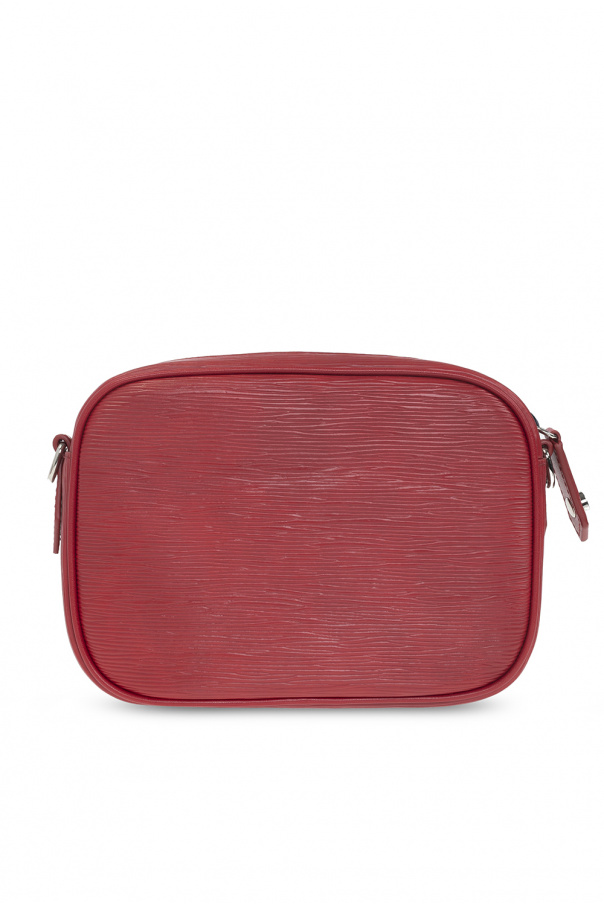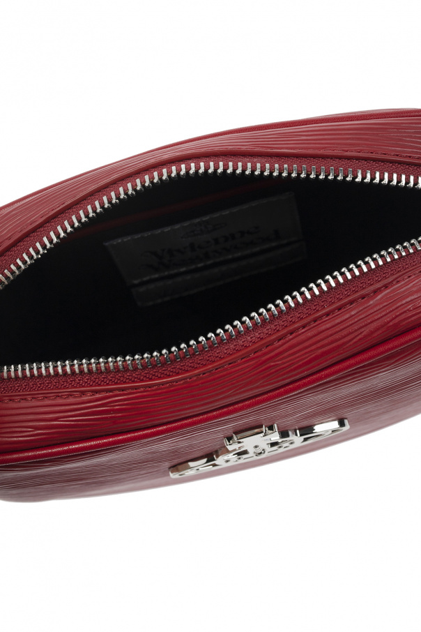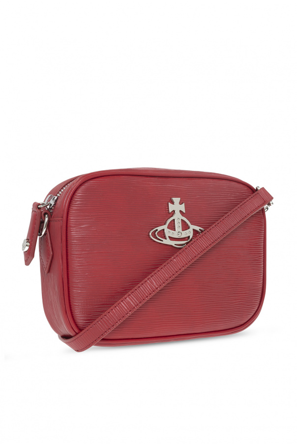 Red 'Anna' shoulder bag from Vivienne Westwood. Made of vegan leather with a special texture. Closed with a zipper. A silver-colored metal logo-shaped applique on the front. Detachable shoulder strap with adjustable length. One compartment and two slip pockets inside. Silver-colored metal elements.