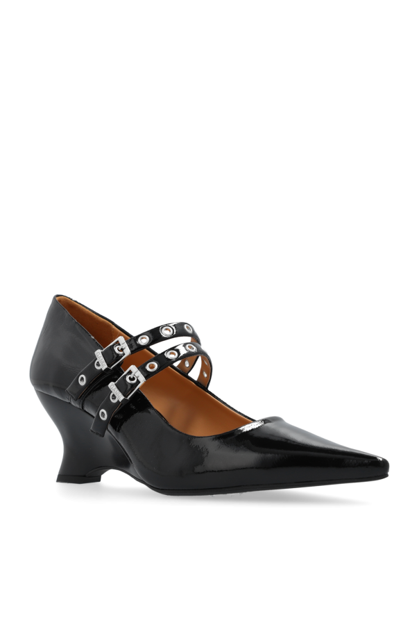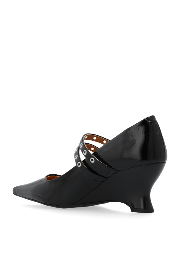 Introducing the Ganni Patent Wedge Shoes, a quintessential embodiment of sophistication and modern flair. Crafted with meticulous attention to detail, these shoes feature a lustrous, patent leather exterior in a deep black hue that effortlessly captures the essence of elegance. The pointed toe silhouette, a hallmark of classic style, is complemented by a low, stable wedge heel, ensuring both comfort and a refined appearance. The front of the shoe is adorned with straps embellished with silver-toned metal elements, adding a contemporary touch and additional support to this exquisite design. The interior, in a contrasting light-brown shade, elevates the overall aesthetic, creating a stunning visual contrast. Made entirely from high-quality, patent rubber, these shoes not only reflect light beautifully but also underscore the exclusive character of the Ganni brand. Why Purchase This Product? Exceptional Comfort: The low wedge heel provides stability without compromising on style. Elegant Design: The polished patent finish and pointed toe shape offer a sleek, sophisticated look. Unique Details: Silver-toned metallic accents and contrasting interior color enhance its distinctive appeal. Versatile Wear: Perfect for a variety of occasions, from everyday wear to special events requiring elegant footwear. Premium Quality: Crafted from high-grade materials, ensuring durability and a luxurious feel.