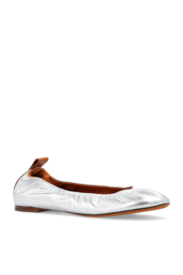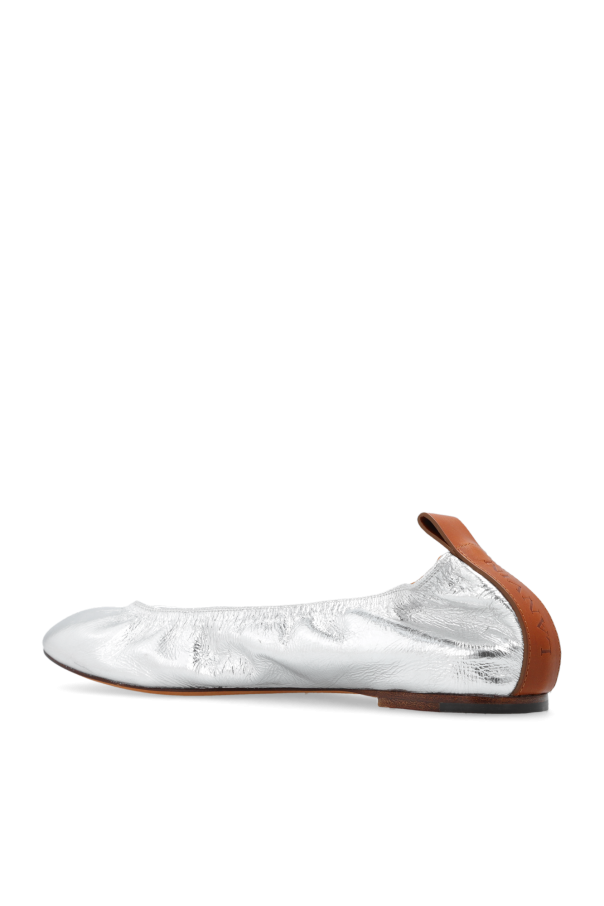 Silver-tone ballet flats from Lanvin. Made of leather with a round toe, this model sits on a brown leather sole and features an elasticized trim and a brown patch with an embossed logo on the back.