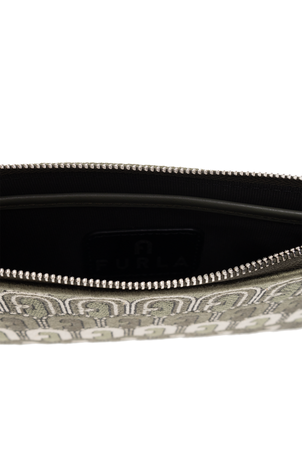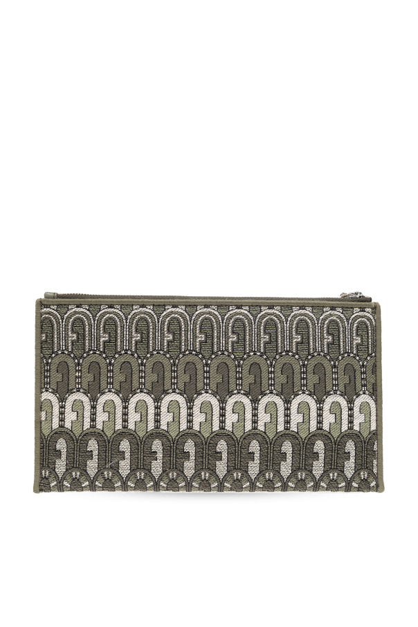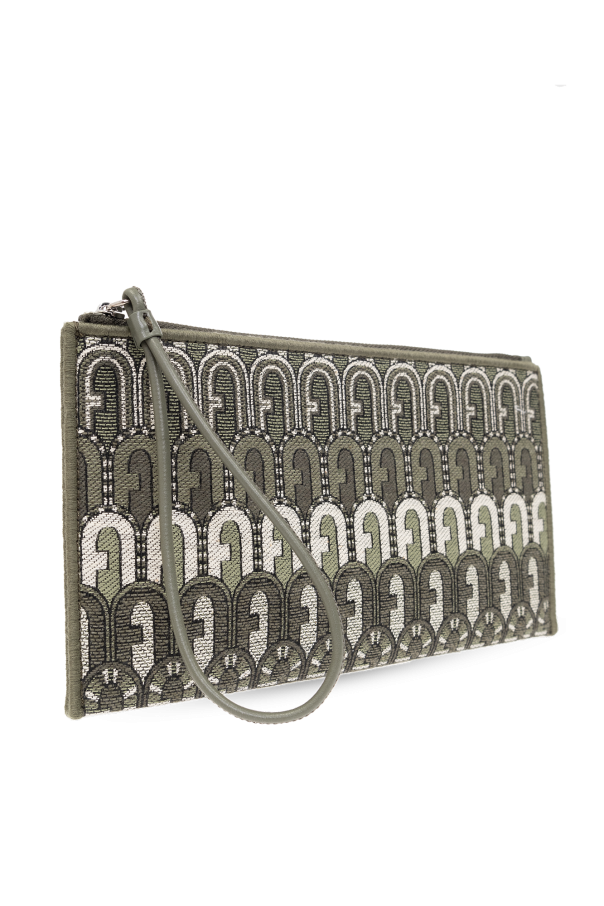 Green and white ‘Opportunity Small’ clutch from Furla. Made from fabric with a jacquard ‘Arch’ pattern, this design secures with a zip including a wrist strap and showcases the brand's logo embroidered with lurex yarn, light gold-tone metal hardware and one internal compartment.