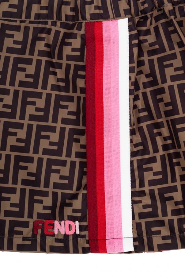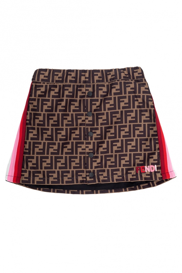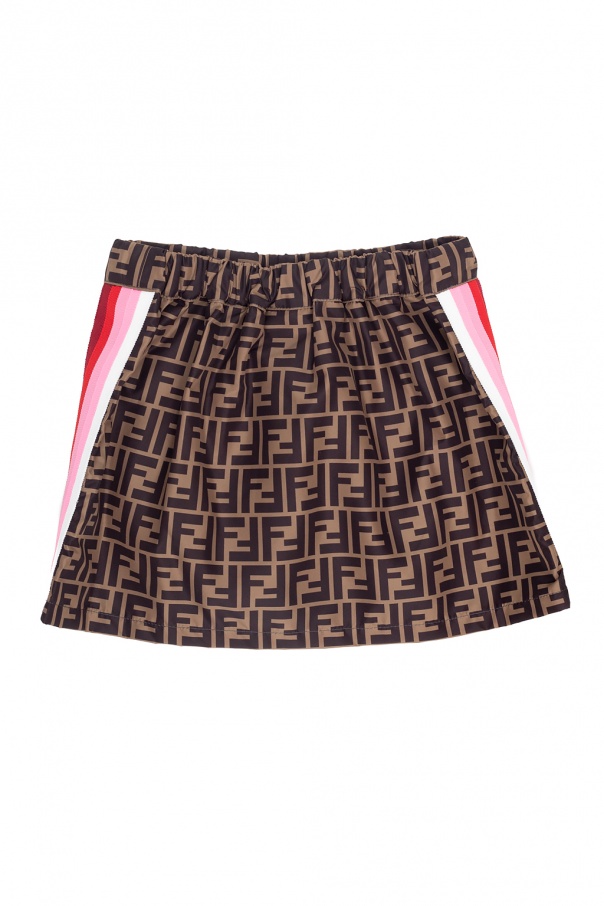 Brown and black skirt from Fendi Kids. Crafted from cotton, this design is complete with an elastic waistband, snap fastening, a logo print, a logo embroidery and side stripes in white, pink and red.