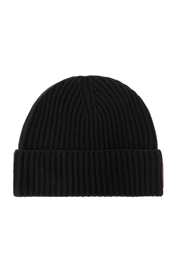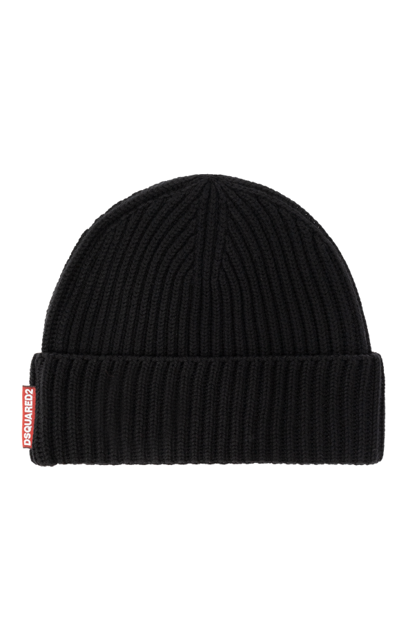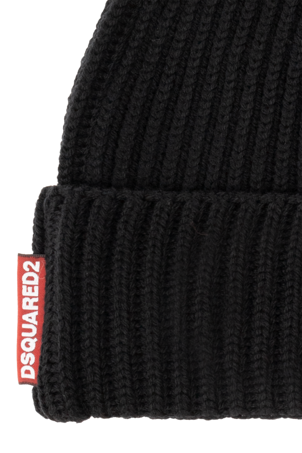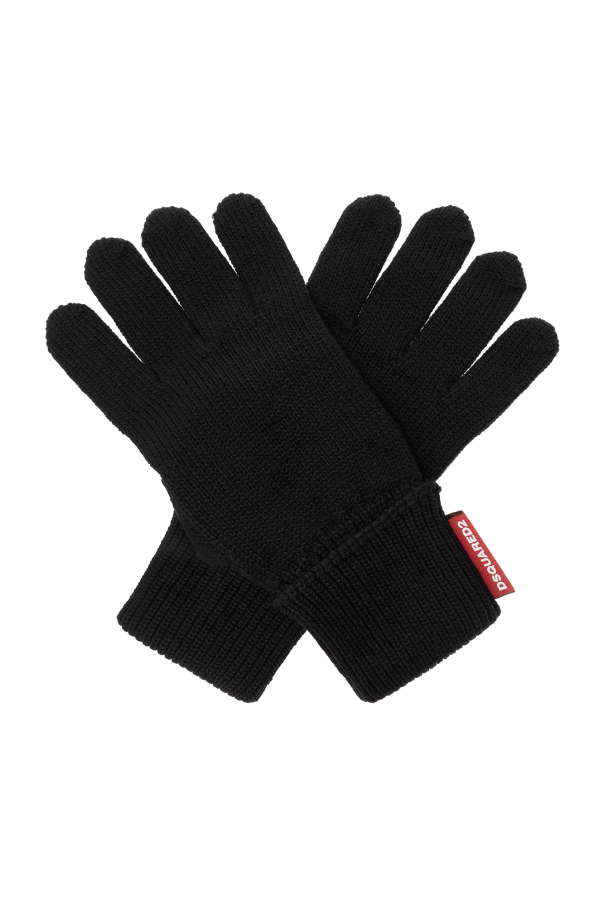 Black beanie & gloves from Dsquared2. Made of wool, both pieces showcase a white and black logo patch.