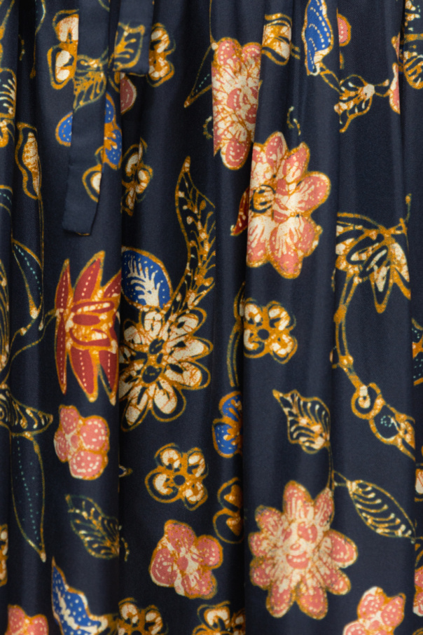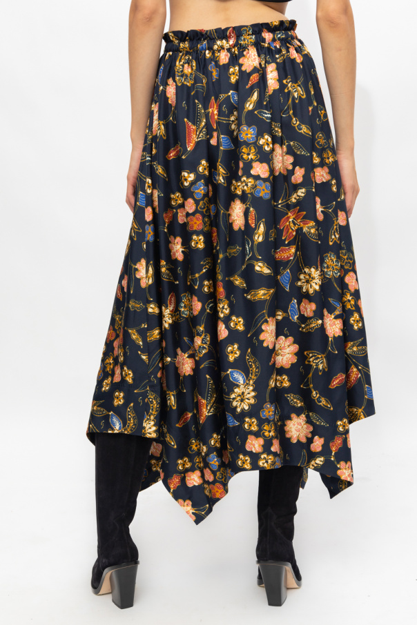 Navy ‘Carine’ pleated skirt from Ulla Johnson. Crafted from silk, this design features an elastic drawstring waistband, multicolored floral motif and asymmetric hem.