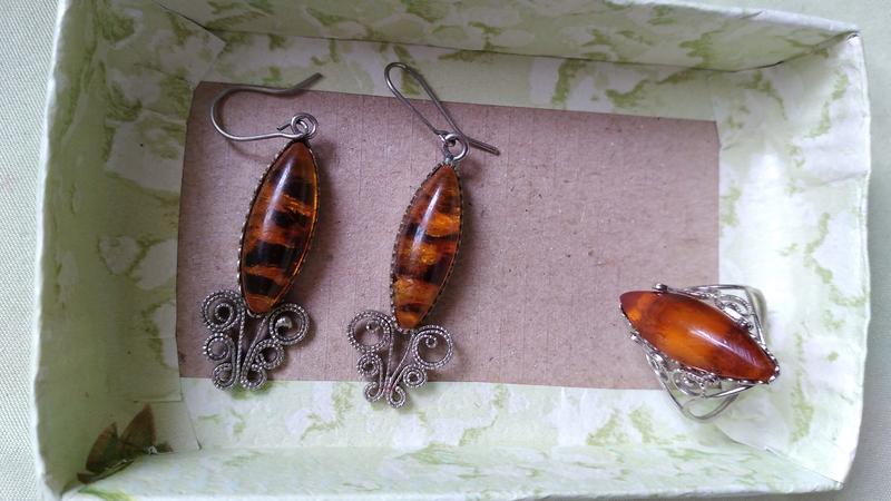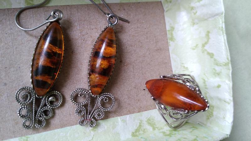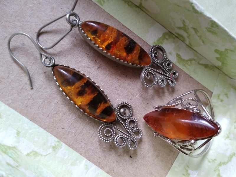 Матеріал: БурштинПродам витончений вінтажний комплект ювелірних прикрас ручної роботи часів ссср: сережки і перстень з бурштином, виконані в стилі фініфть, з ажурними мельхіоровими завитками, бурштинові вставки у вигляді довгастих кабошонів довжиною 2,5 см. Довжина сережок 4 см, - 18.