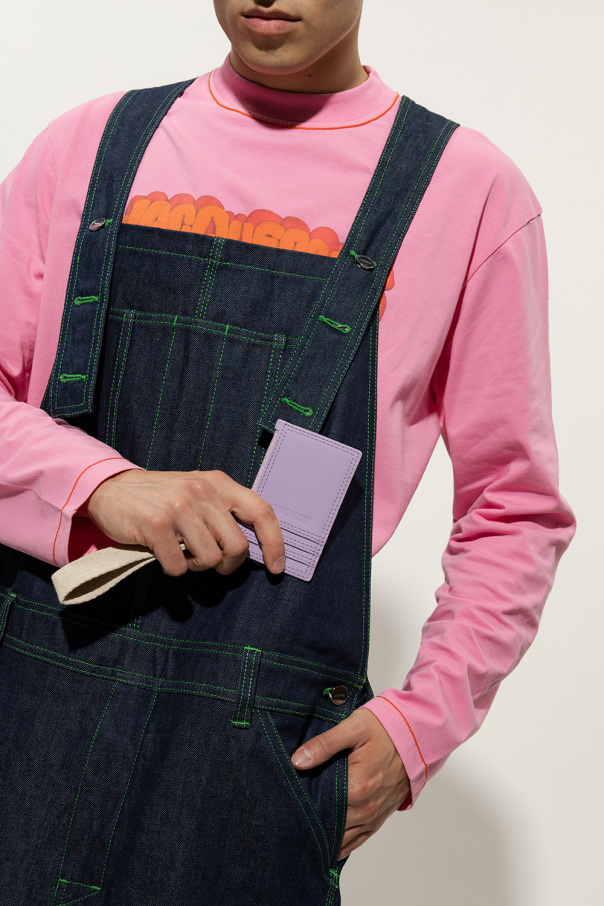 Light purple card case from Jacquemus. Made from rubberised leather, this design features a zip pocket with a cream canvas wrist strap, an embossed logo on the front and three card slots inside.