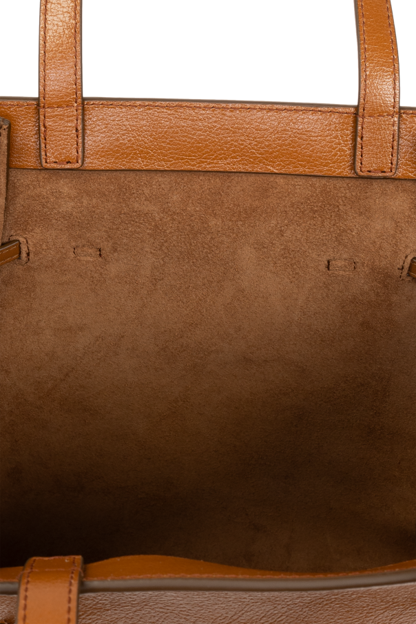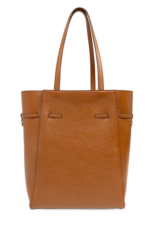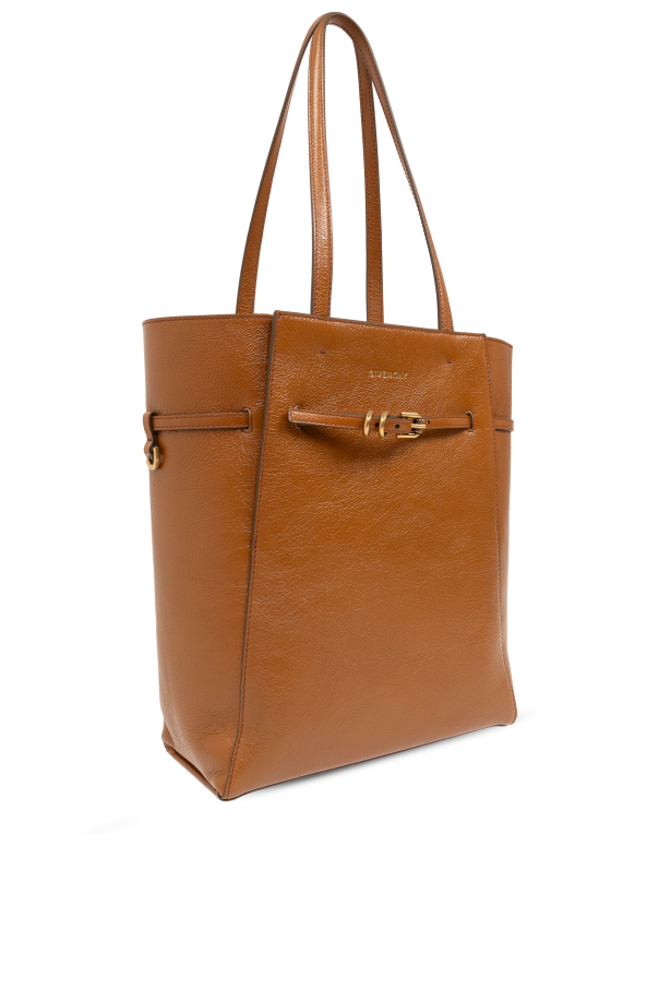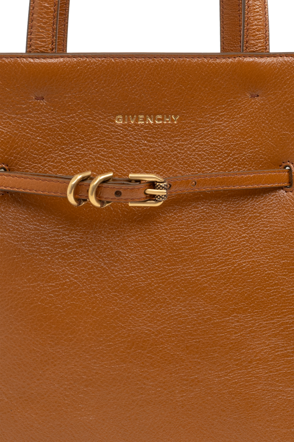 Introducing the 'Voyou Small' Shopper Bag by Givenchy, a paragon of elegance and functionality tailored for the discerning fashion aficionado. Crafted from premium Buffalo leather with a visible texture that enhances its durability and aesthetic appeal, this brown tote epitomizes luxury and resilience. The rectangular silhouette with vertical sides and a flat bottom ensures stability, allowing the bag to stand gracefully. A golden logo emblem adorns the front, complemented by a distinctive buckle linked to a slender leather strap. This adjustable strap offers both decorative flair and a modicum of shape customization, making the 'Voyou Small' not just a bag, but a statement. Side panels showcase vertical stitching and tiny, metallic rivets, potentially serving as attachment points, while the relatively long handles offer comfortable shoulder wear. An expandable feature, revealed through a zip, ingeniously increases its capacity, catering to your varying needs. The interior and the back of the bag are sleek and minimally designed, focusing on a spacious main compartment devoid of additional pockets, highlighting a minimalist yet practical approach. Why Purchase This Product? Constructed from exquisite Buffalo and Calfskin leather, ensuring both elegance and durability. Features a unique adjustable buckle for aesthetic enhancement and shape regulation. Includes an expandable compartment for adaptable space. Boasts Givenchy's distinguished design with subtle yet recognizable details, like the golden logo and decorative buckle. Designed for comfortable shoulder wear, perfect for daily use or sophisticated occasions.