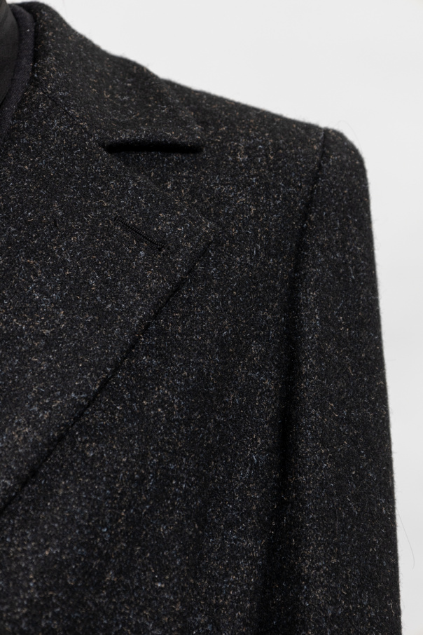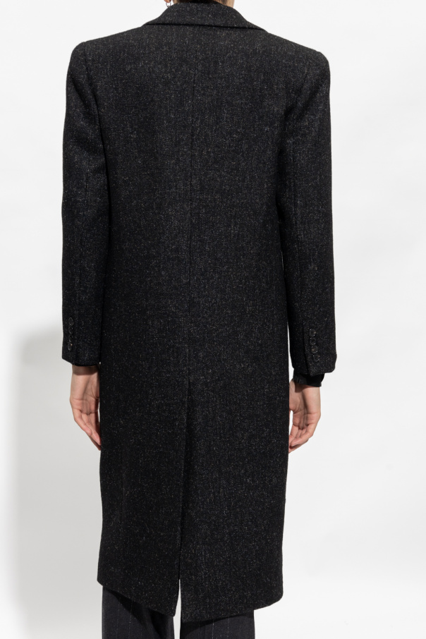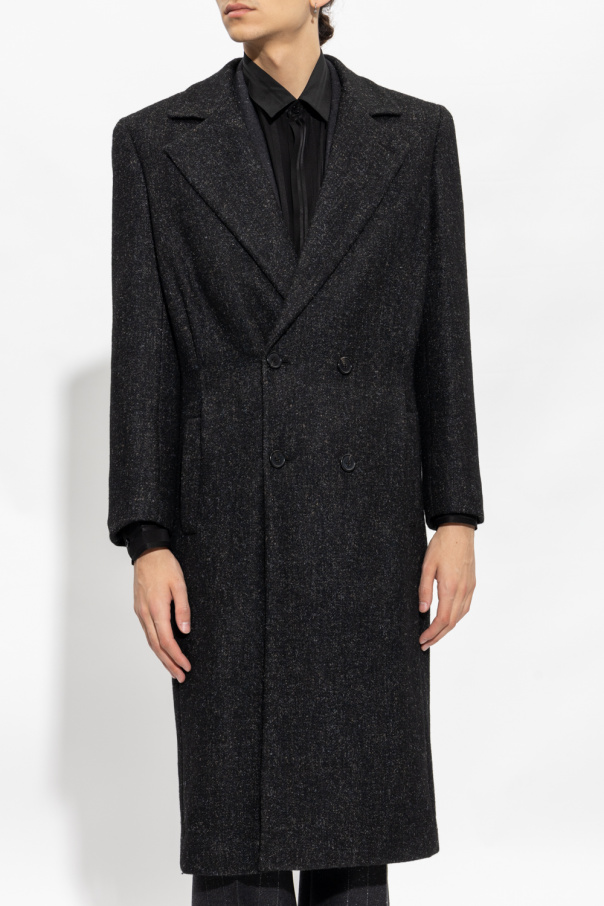 Black double-breasted coat with notch lapels from Saint Laurent. Made of wool, this garment features button fastenings, beige and grey trims, two front pockets, long sleeves and single rear vent.