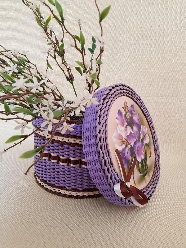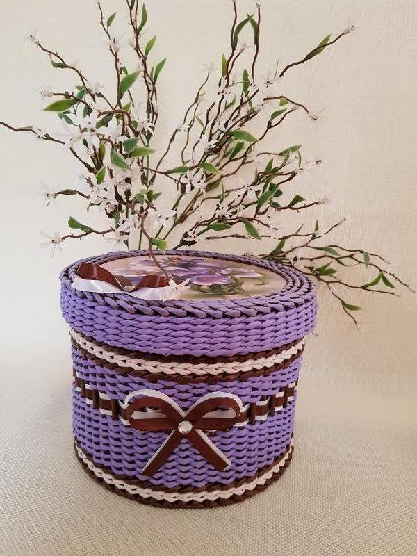 Изготовлена в технике плетение из бумажной лозы. Использованы только безопасные материалы, шкатулка покрыта акриловым лаком на водной основе, крепкая и прочная, не боится влаги. Крышечка и донышко из гофрокартона декорированого декупажем.