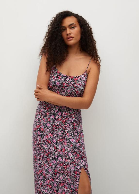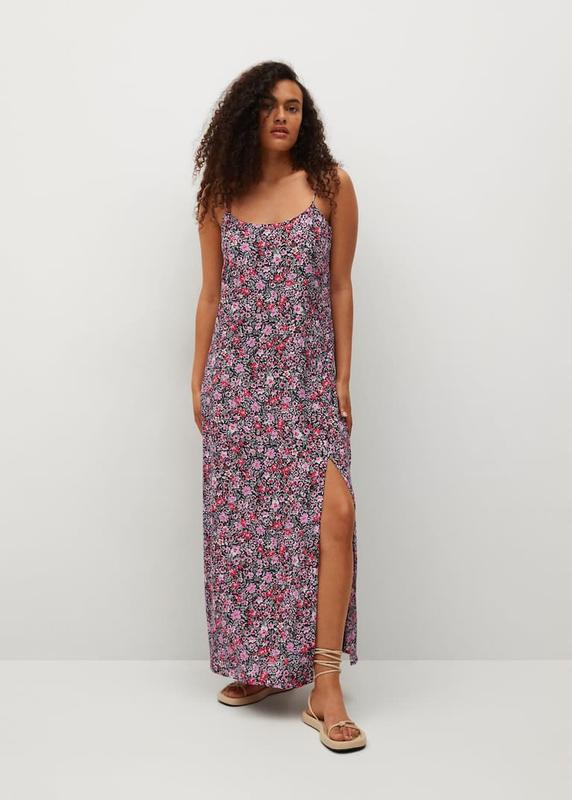 Струмуюча тканина, квітковий візерунок, довга модель, прямий крій, тонкі бретельки, круглий виріз, бічний розріз
