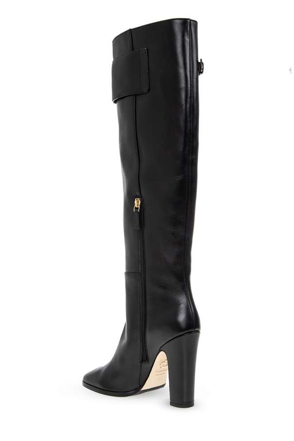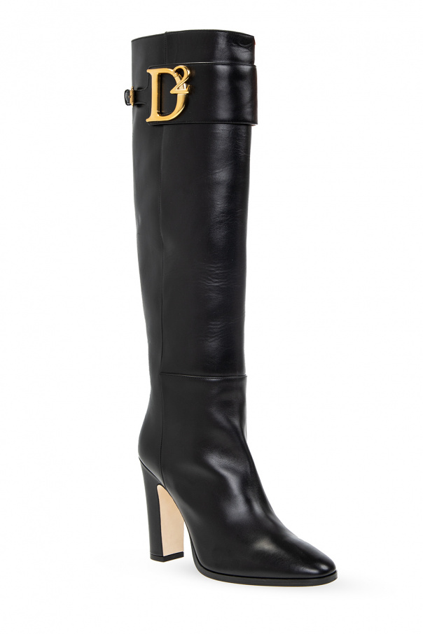 Black ‘Statement’ boots from Dsquared2. Crafted from calf leather, this model sits on a beige and black sole made of leather and rubber and showcases an almond toe and a buckle strap accentuated with a gold-tone logo appliqué.