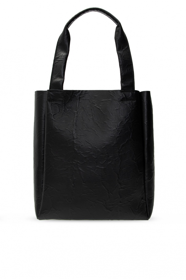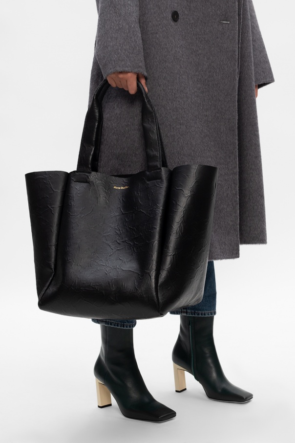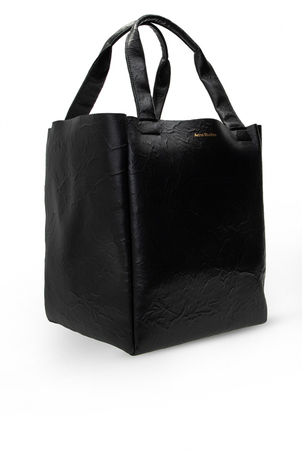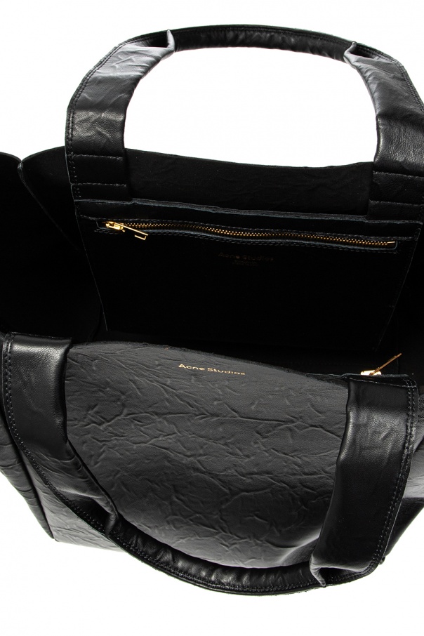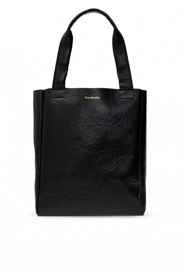 Black shopper bag from Acne Studios. Crafted from lamb leather, this model fastens with ties and is complete with a gold-tone logo print, two half-round handles and one internal compartment with two zip pockets.