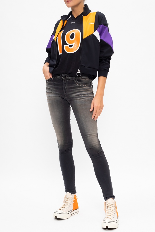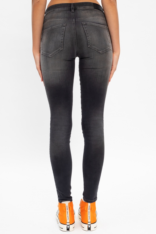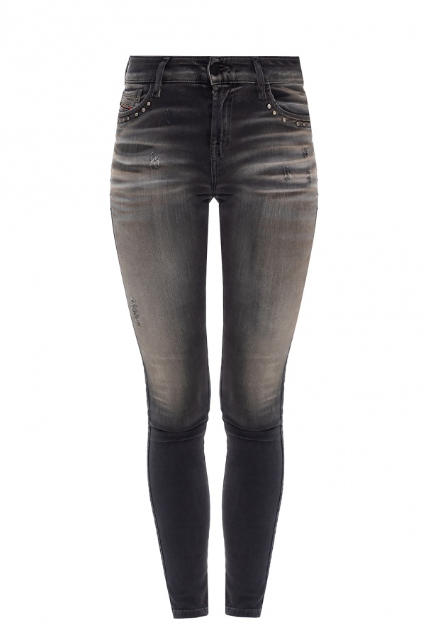 Grey ‘Slandy’ distressed jeans from Diesel. Fastened with a zip and button, this tapered leg design features studs, five slip pockets and a black logo patch at the back.
