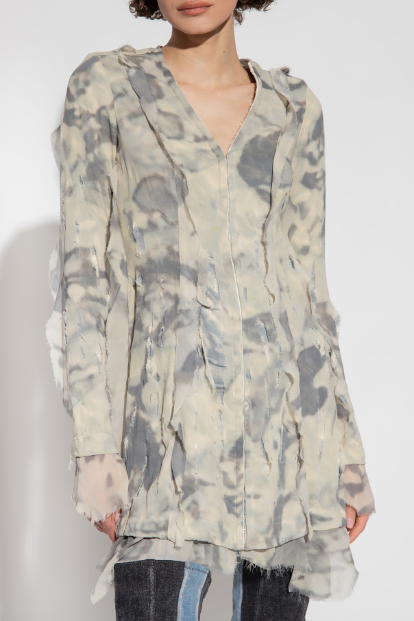 Grey and beige 'D-NINA' silk dress with a vintage effect from Diesel. Made of silk, this style fastens with hook & eye closures on the front and showcases a V-neckline, multiple slashes and long sleeves with zipped cuffs.