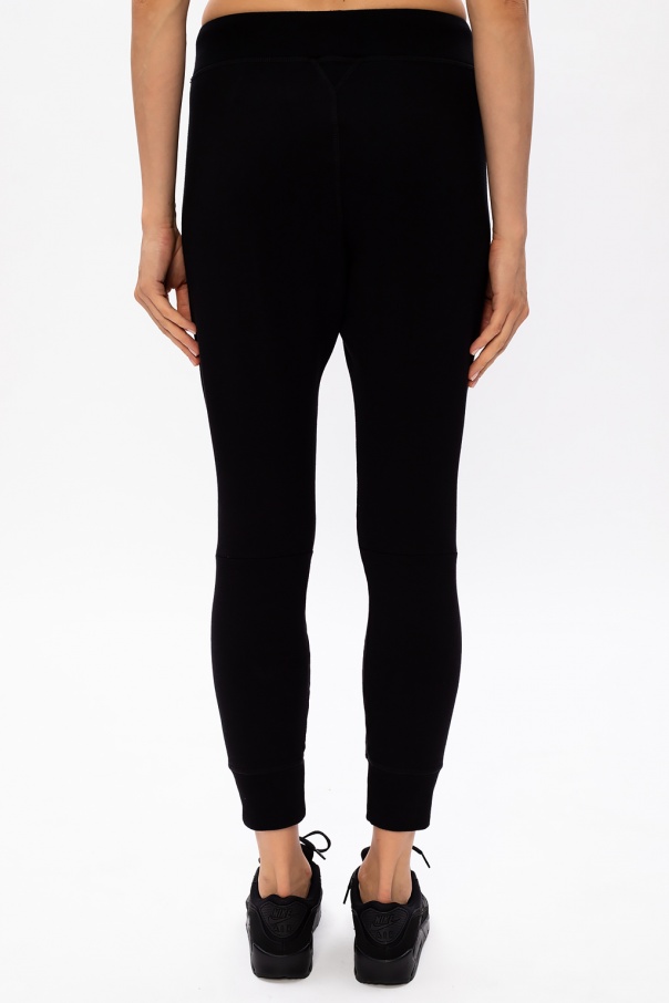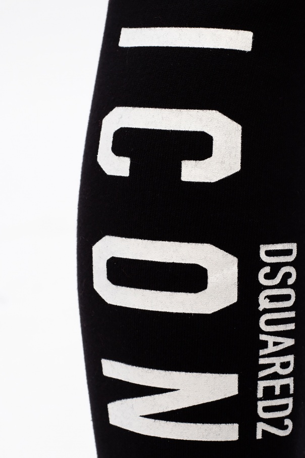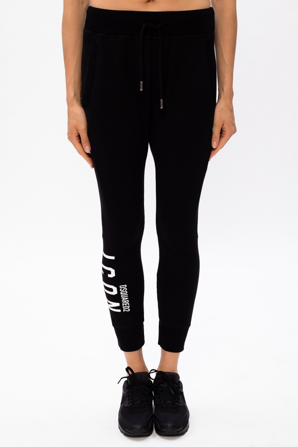 Black sweatpants from Dsquared2. Made of cotton, this item features an elastic waistband, drawstrings, two slip pockets, printed logo pattern in white and ribbed cuffs.