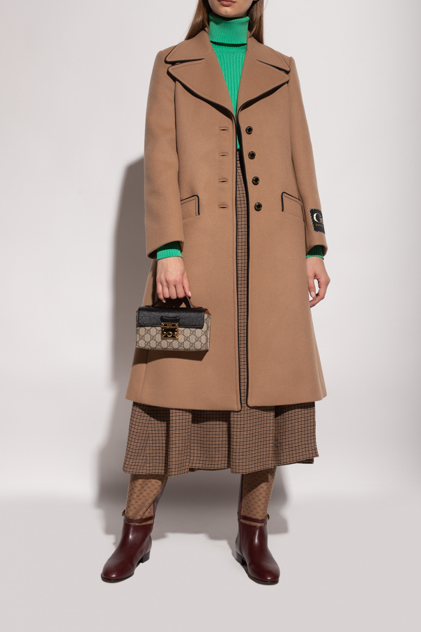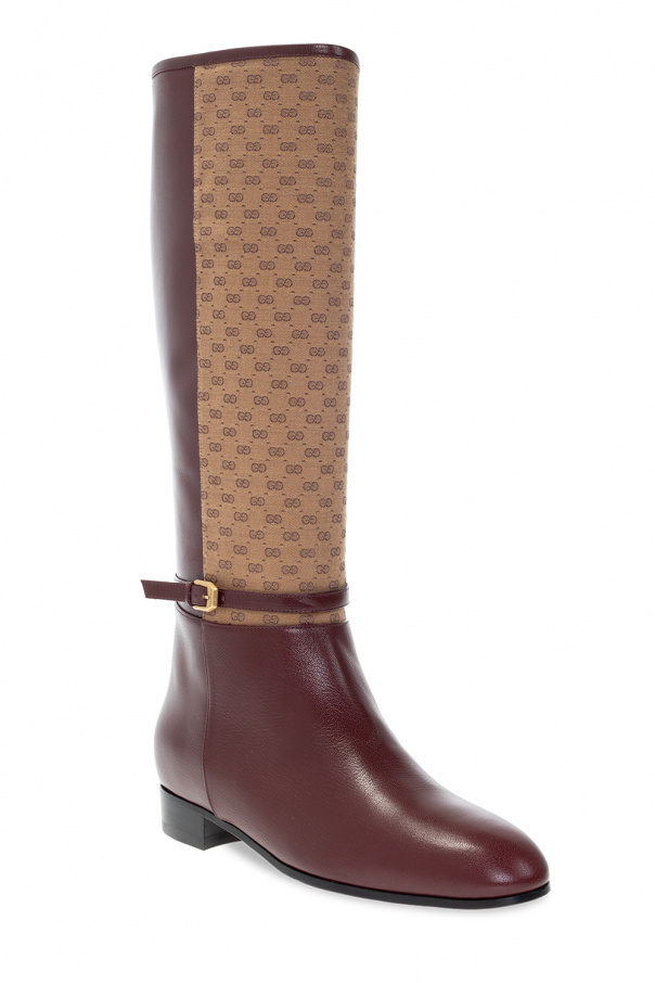 Maroon and brown knee-high boots from Gucci. Crafted from leather, this model sits on a beige and black rubber sole and showcases a monogram pattern, a gold-tone logo print on the back and a buckle strap closure.