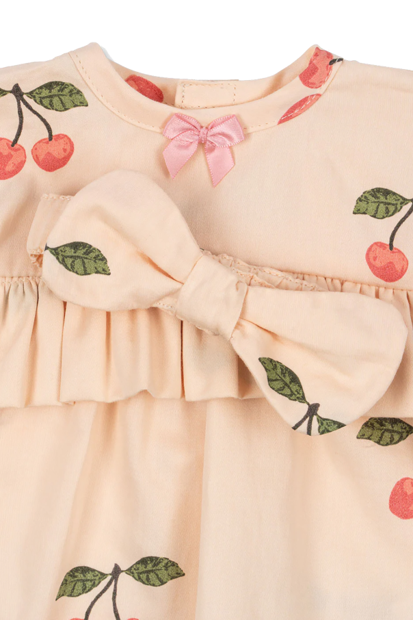 Introduce your little one to a world of elegance and charm with the Set: Headband and Dress for Doll by Konges Sløjd. This exquisite ensemble captures the essence of childhood innocence and grace, featuring a classic dress with long sleeves and a waist ruffle adorned with a delightful cherry pattern. The dominant soft pink hue imbues the set with a sense of delicate sophistication. Crafted from 100% Organic Cotton, this set promises a gentle touch, perfect for a child's playthings. The accompanying headband, embellished with a bow, mirrors the dress's pattern and color, ensuring a cohesive and elegant look. A small pink bow on the dress's front adds a touch of refinement, making it an irresistible accessory for doll play. Why Choose This Product? Designed by the esteemed Danish brand, Konges Sløjd, known for sustainable and environmentally friendly practices. Made from certified organic materials, ensuring safety and comfort. Features a unique cherry print, adding a playful yet stylish element to any doll's wardrobe.