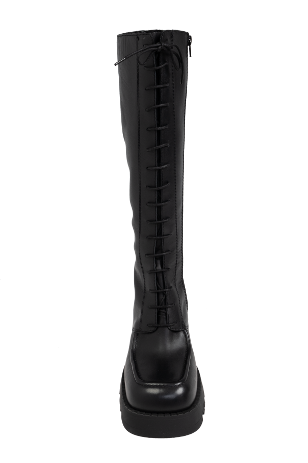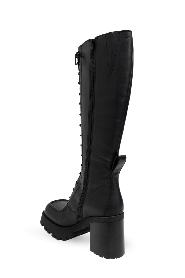 Introducing the exclusive Grit knee-high lace-up boots by Miista. These exceptional boots are the epitome of elegance and modernity, masterfully crafted to offer both style and comfort. The Grit boots feature a sophisticated shape, reaching up to the knees, with a sturdy square heel that ensures stability while exuding refined elegance. Their thick, rugged sole not only provides excellent traction but also imparts a contemporary edge to their design. Meticulously made from smooth, high-quality leather, these boots radiate luxury. The interior is also lined with leather, ensuring unparalleled comfort throughout the day. The full-length lace-up front allows for a perfect fit, while the discreet inner side zipper facilitates easy wear. A small loop at the back adds a practical touch for effortless donning. With their deep black hue, these boots are the ultimate in versatility and sophistication. The modern, elegant look is accented with a hint of rock-chic style, thanks to the robust sole and detailed lacing. Whether paired with casual or more formal ensembles, the Grit boots are an adaptable addition to any wardrobe. Why Choose This Product? Exquisite craftsmanship from high-quality leather materials Distinctive design combining elegance with a modern edge Exceptional comfort with leather-lined interior Versatile style suitable for various occasions Convenient lacing and zipper for a customized fit