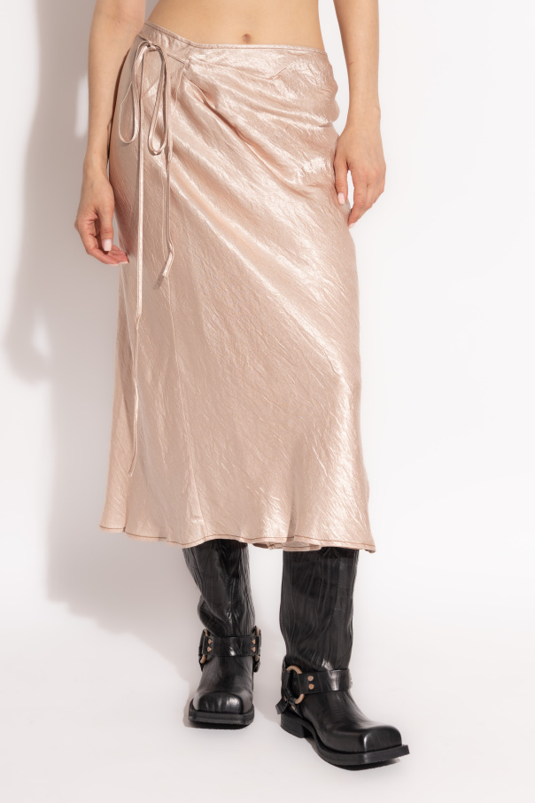 Introducing the quintessence of sophistication and refined taste: the Beige Satin Skirt from Acne Studios. This midi-length masterpiece, designed for those who covet elegance and exceptional quality, is a testament to the timeless appeal of simplicity merged with luxury. Crafted from 100% acetate, its satiny texture exudes a subtle sheen, enhancing the skirt's fluidity and lightness. The color, a serene beige, is impeccably smooth, devoid of any prints or embellishments, accentuating the fabric's lustrous quality. The skirt boasts a cleverly designed elastic waistband for an optimal fit, complemented by a side tie detail that not only serves as a decorative flourish but also allows for waist width adjustment. Its edges are meticulously finished to highlight the material's flow and delicacy. Moreover, the wrap-around style and decoratively crinkled fabric introduce an element of understated drama, making this skirt a versatile statement piece. Why Purchase This Product? Elevates any wardrobe with its elegant design and satiny sheen. Adjustable fit thanks to the elastic waistband and side tie, ensuring comfort and style. Exemplifies Acne Studios' commitment to high-quality materials and craftsmanship. The sophisticated beige tone and smooth satin finish make it a timeless asset. Unadorned elegance allows for seamless integration into both casual and formal ensembles.