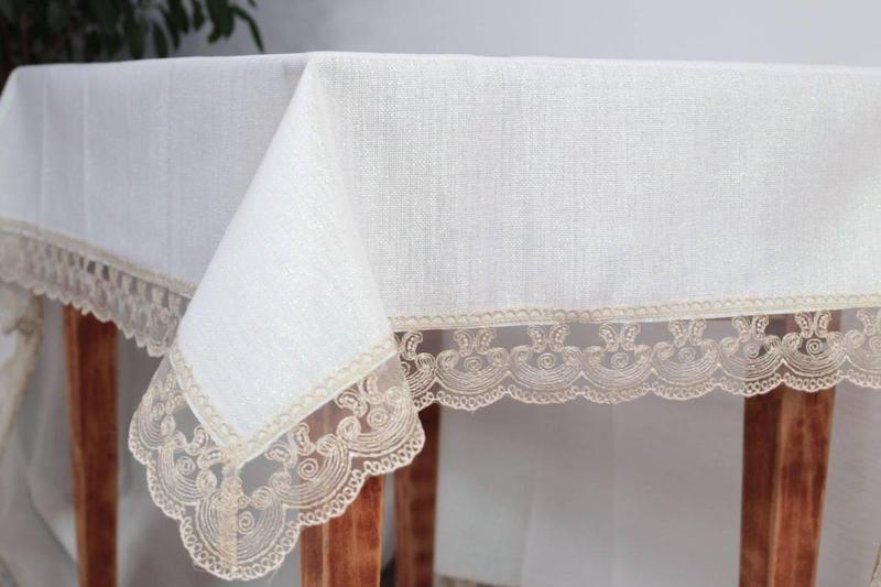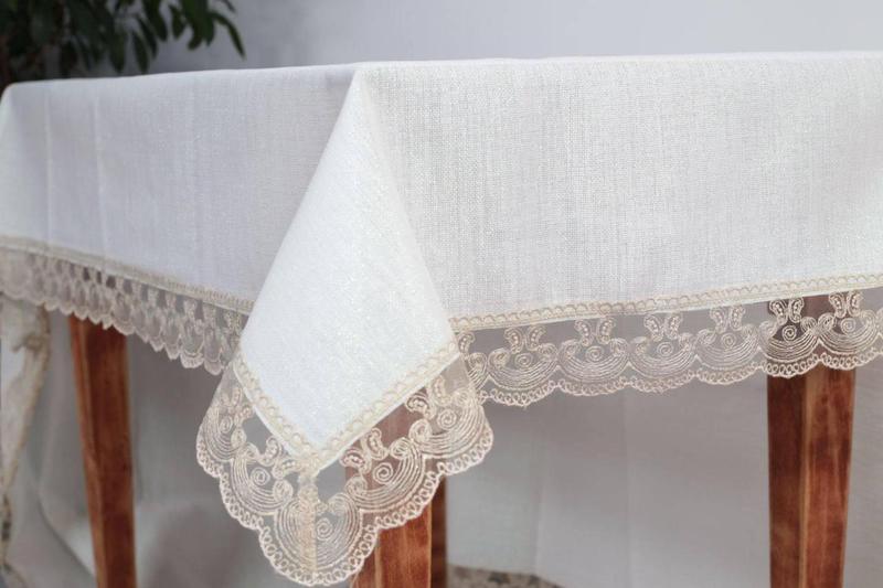 тканями. Льняные скатерти, декорированные кружевом, выглядят как настоящие